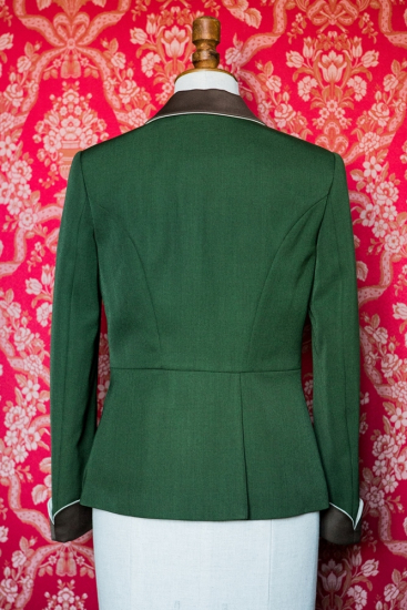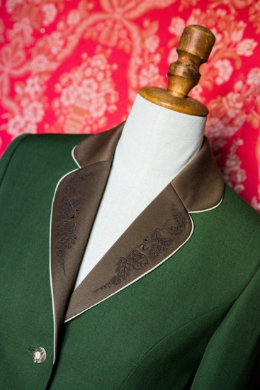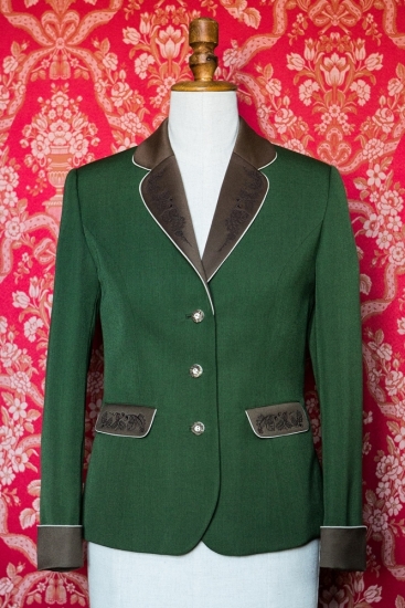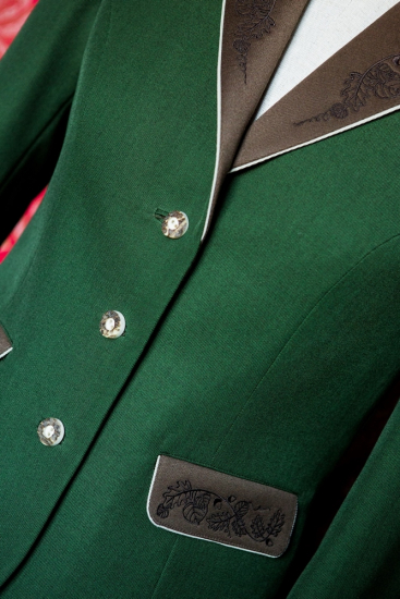 Grüne Farbe ist gerade dann elegant, wenn sie von weiteren Farben ergänzt wird. Die Kombination von Grün und Braun, durch eine dunkelbraune Stickerei unterstrichen, ist in der Jagdwelt eine elegante Sicherheit. Präzisierter Schnitt wird Ihre Frauenkurven unterstreichen und genauso werden Sie von der professionellen Ausarbeitung der Stickerei und von den handwerklich hervorragend gemeisterten Paspeln am Kragen, am Revers, an den Taschenpatten und Ärmelmanschetten bezaubert sein.