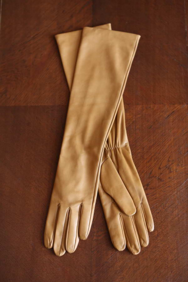 Höhere Karamell-Lederhandschuhe bedecken den Unterarm und sind ein schönes Accessoire zu den Wollpaletots.