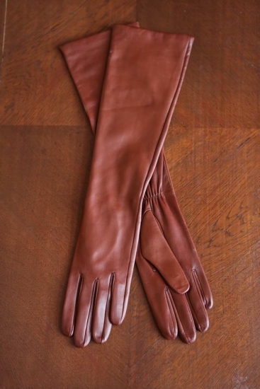 Höhere Kognak-Lederhandschuhe bedecken den Unterarm und sind ein schönes Accessoire zu den Wollpaletots.