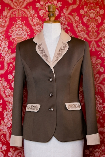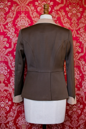 Die Jacke in Farbe Milchschokolade, mit Cappuccino und milder Paspel in Farbe Elfenbein kombiniert, wird Sie schön unterstreichen und warum sollte man das Unterstrichen nicht fortsetzen. Körpernahe Hose und schöne Lederschuhe werden Sie zwingen, über weitere Lederaccessoires nachzudenken, und wir empfehlen, allem noch durch ein grünes, orangefarbiges oder rotes Tuch den Pfiff zu geben. Der braune Gabardine hat etwas größeres Flächengewicht als der für Jacken verwendete Gabardine in Farbe Elfenbein, also ist etwas schwerer und „wärmer".