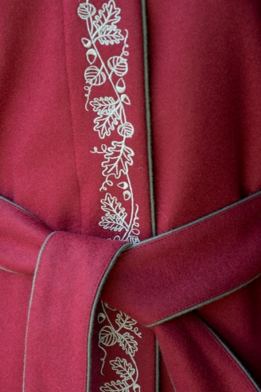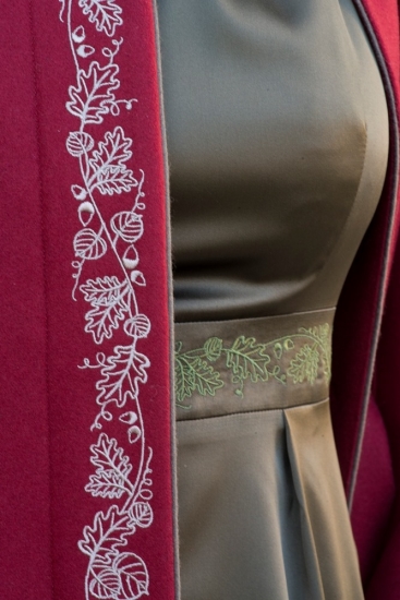 | Stickerei: | mit einem Cappuccino-Faden gesticktes reichliches Eichen- und Lindenlaub |